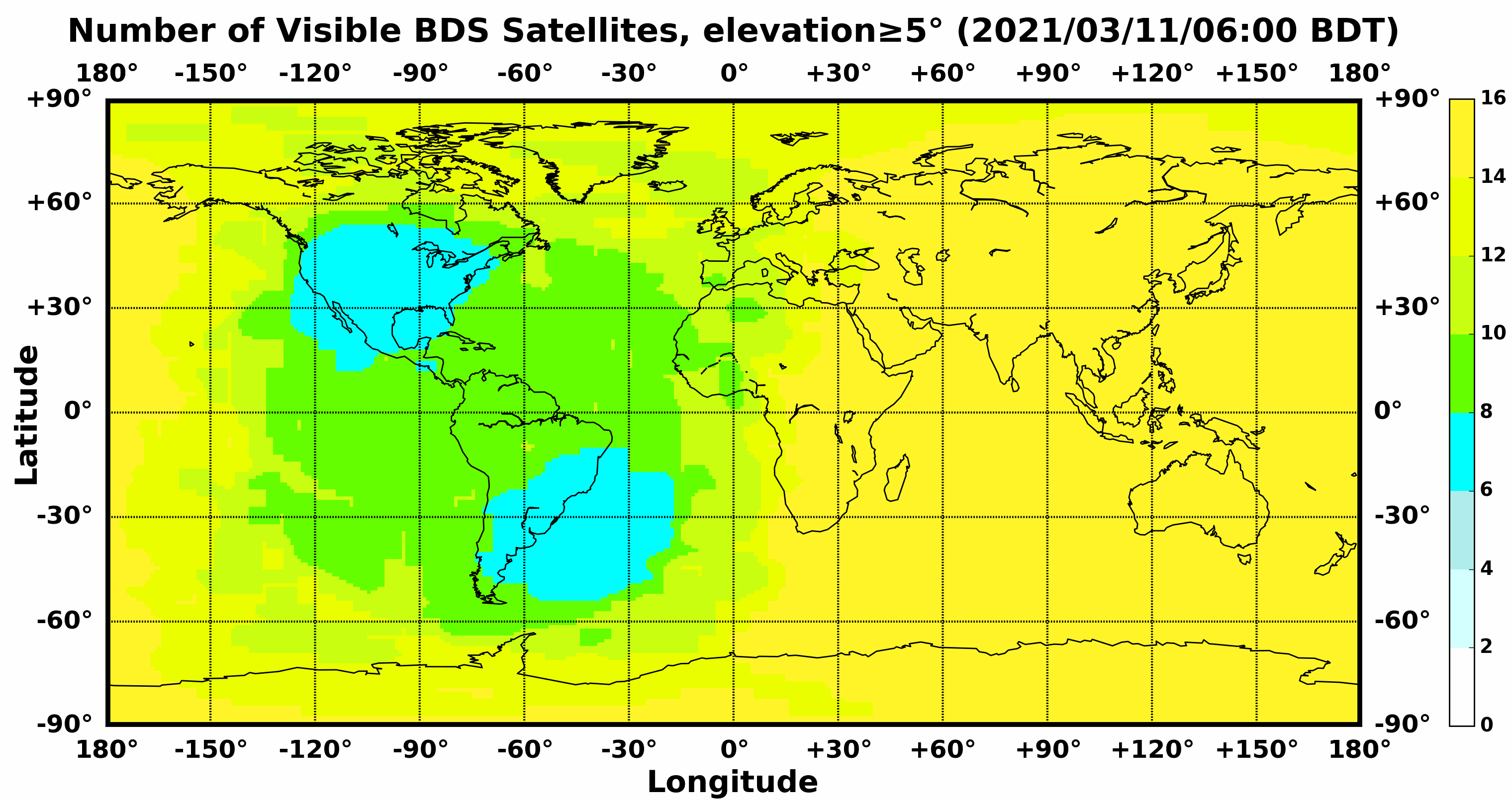 此处显示的是北斗卫星导航系统在全球任意地点可以看到的卫星数目,用不同颜色表示不同数值(颜色与数值的对应情况参见右侧的图例)。