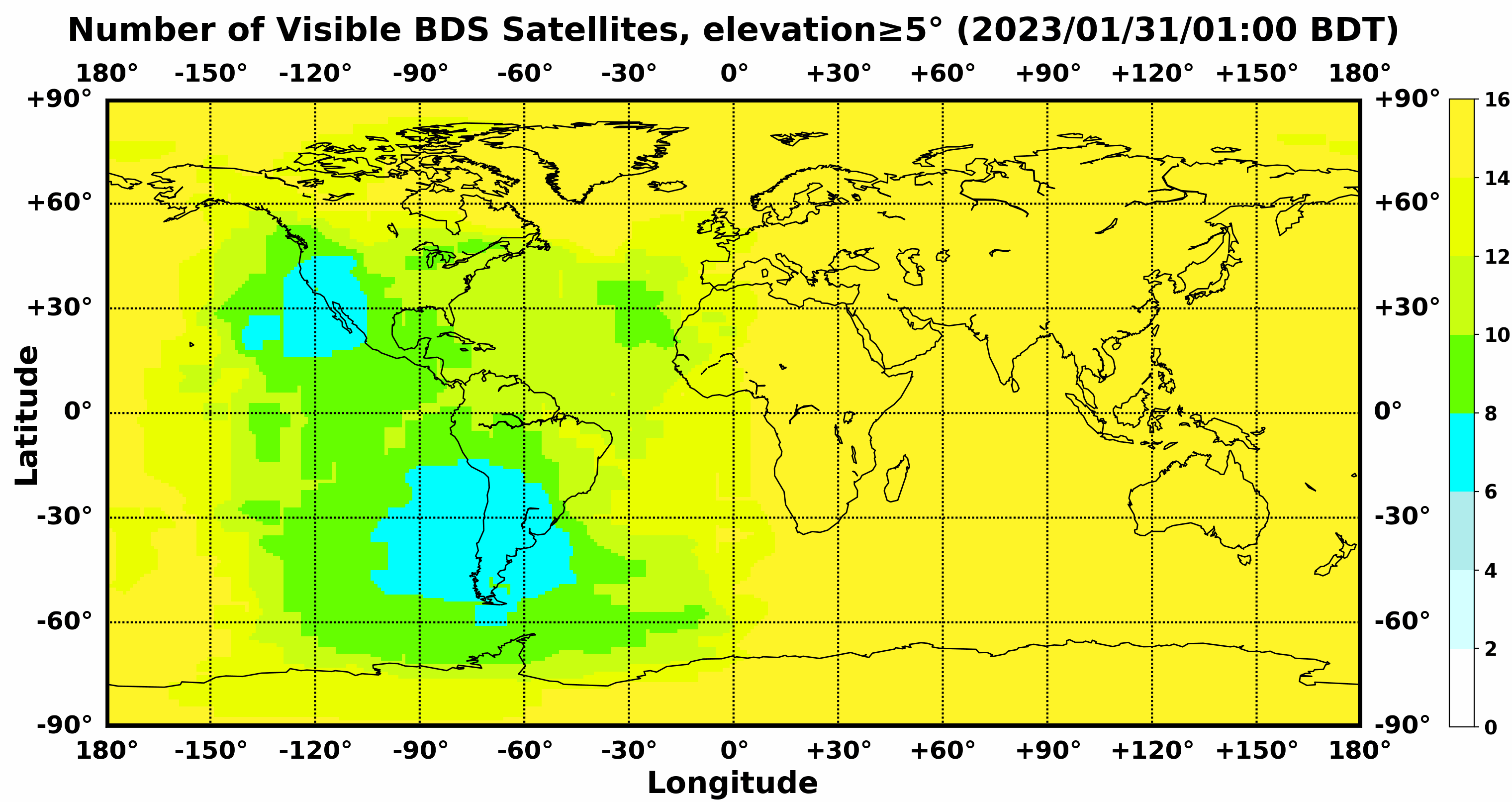 此处显示的是北斗卫星导航系统在全球任意地点可以看到的卫星数目,用不同颜色表示不同数值(颜色与数值的对应情况参见右侧的图例)。