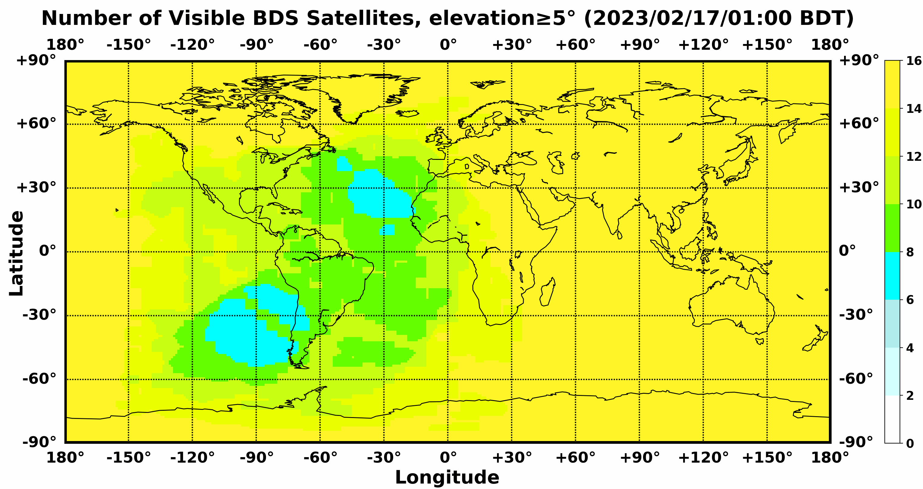 此处显示的是北斗卫星导航系统在全球任意地点可以看到的卫星数目,用不同颜色表示不同数值(颜色与数值的对应情况参见右侧的图例)。