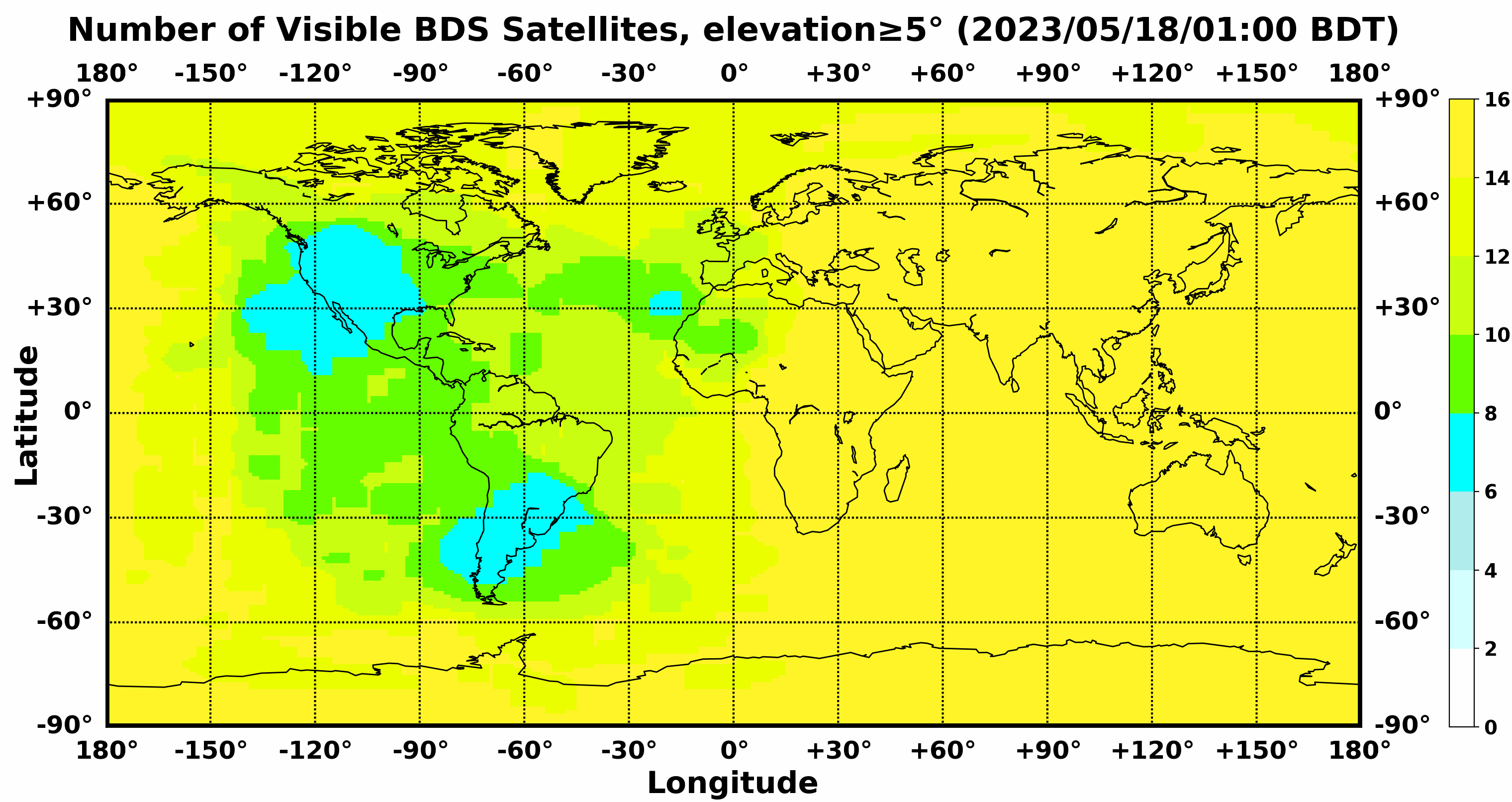 此处显示的是北斗卫星导航系统在全球任意地点可以看到的卫星数目,用不同颜色表示不同数值(颜色与数值的对应情况参见右侧的图例)。