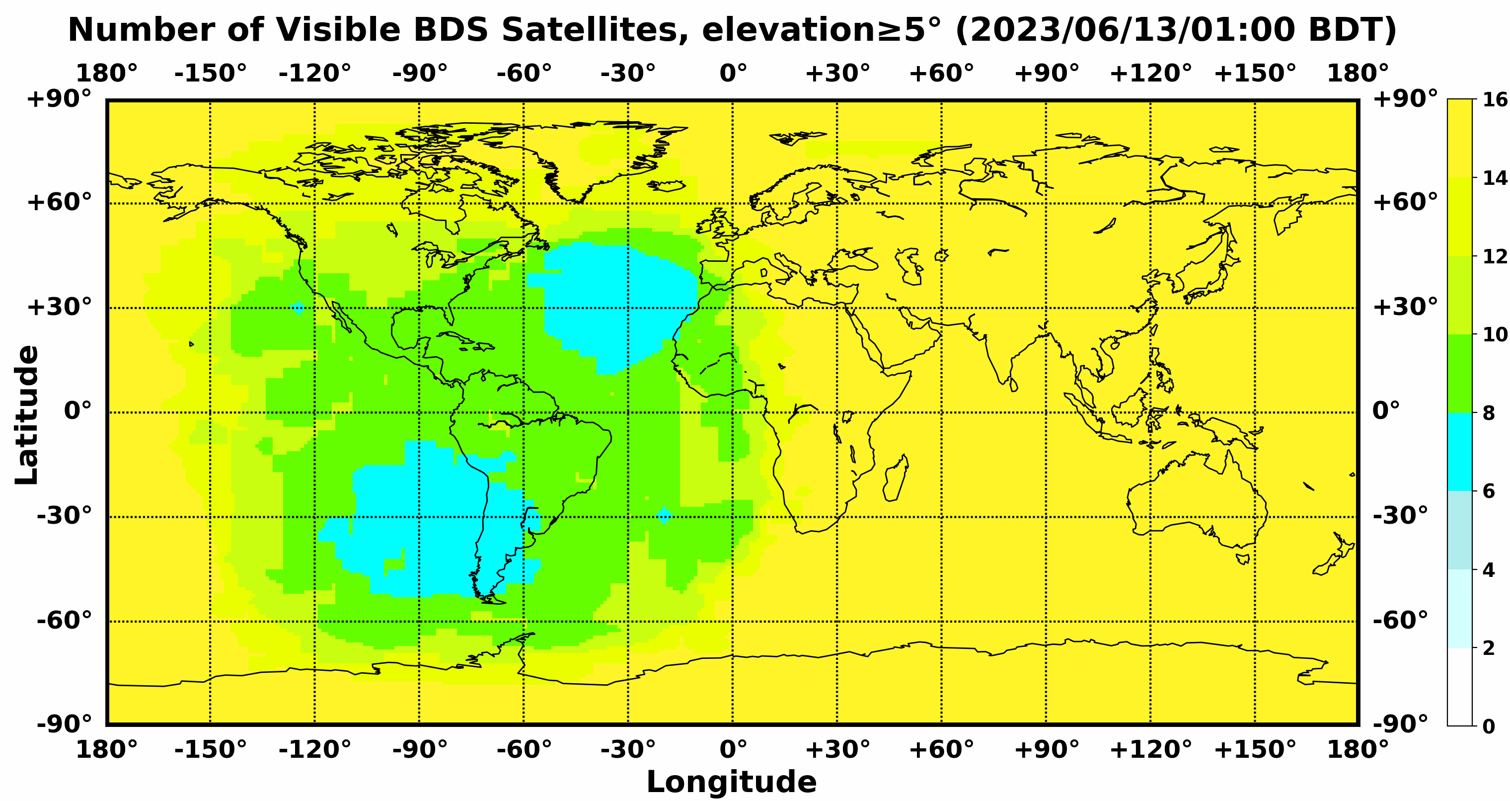 此处显示的是北斗卫星导航系统在全球任意地点可以看到的卫星数目,用不同颜色表示不同数值(颜色与数值的对应情况参见右侧的图例)。