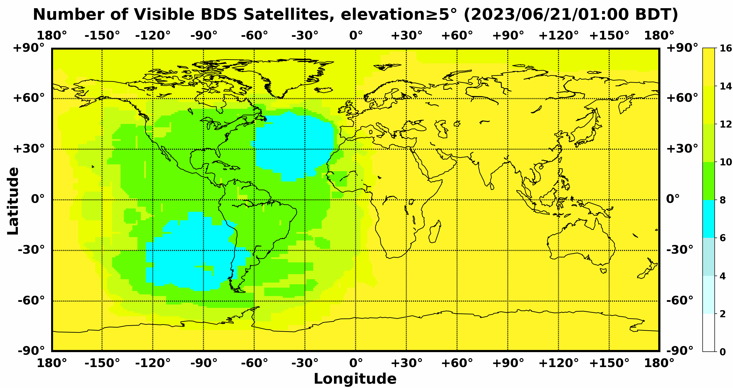 此处显示的是北斗卫星导航系统在全球任意地点可以看到的卫星数目,用不同颜色表示不同数值(颜色与数值的对应情况参见右侧的图例)。