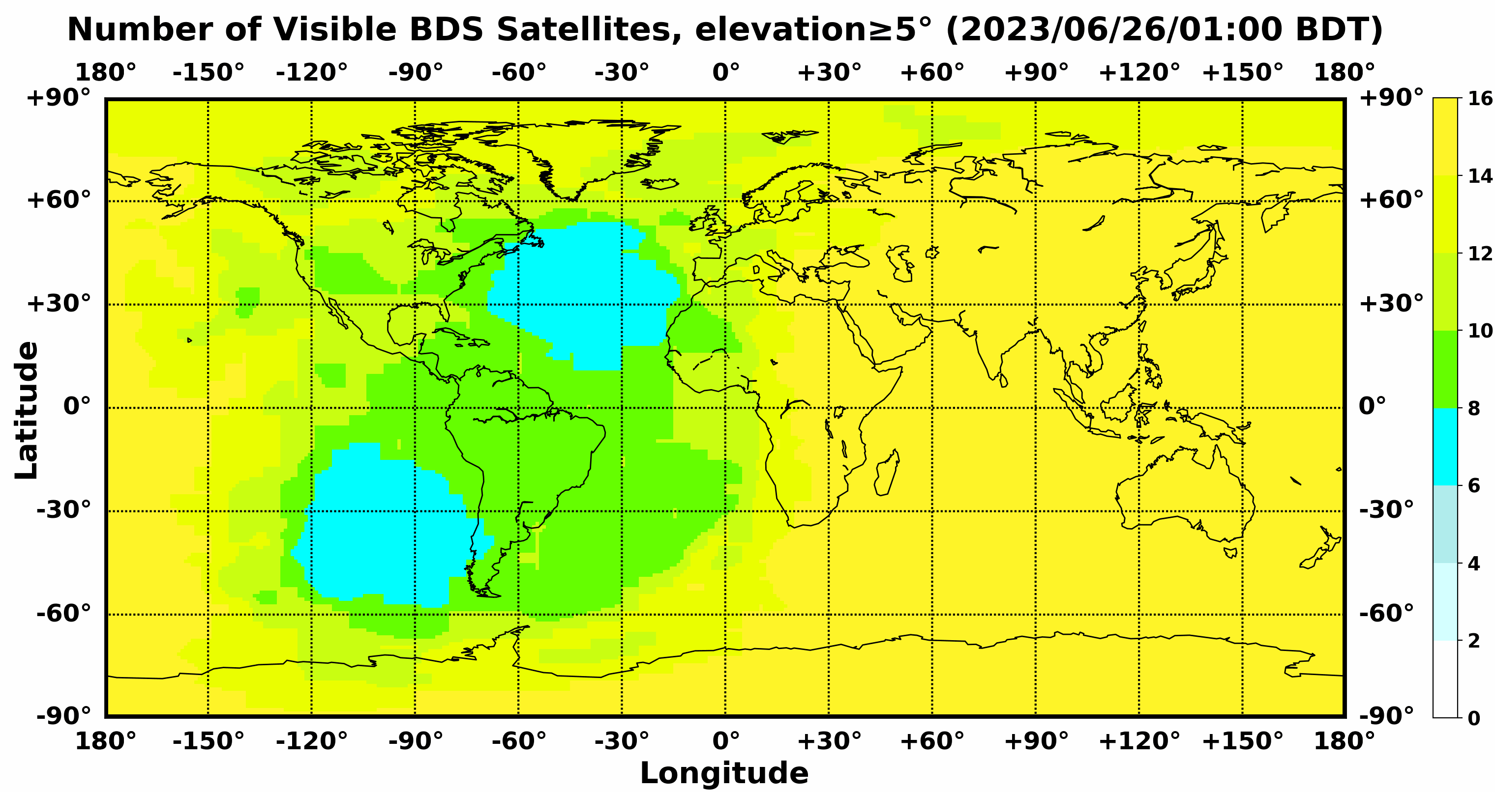 此处显示的是北斗卫星导航系统在全球任意地点可以看到的卫星数目,用不同颜色表示不同数值(颜色与数值的对应情况参见右侧的图例)。