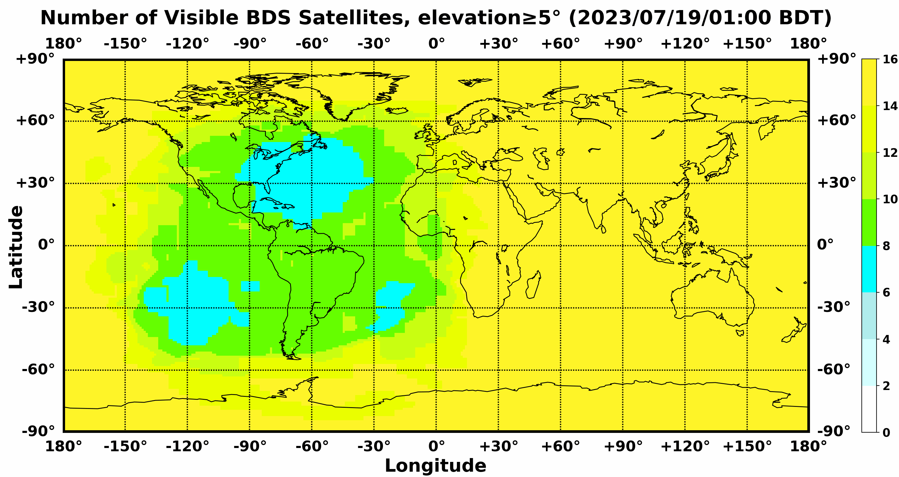 此处显示的是北斗卫星导航系统在全球任意地点可以看到的卫星数目,用不同颜色表示不同数值(颜色与数值的对应情况参见右侧的图例)。