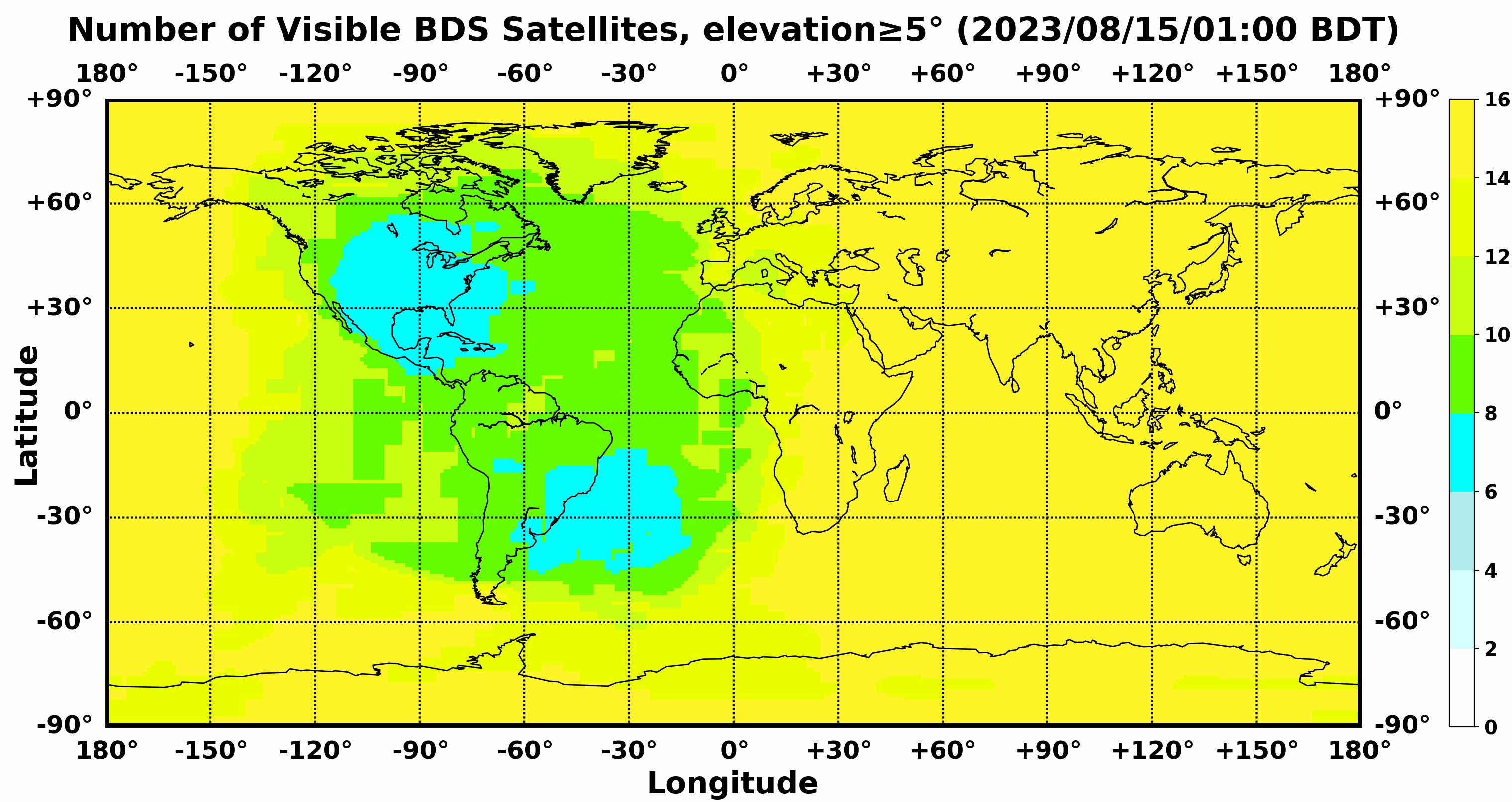 此处显示的是北斗卫星导航系统在全球任意地点可以看到的卫星数目,用不同颜色表示不同数值(颜色与数值的对应情况参见右侧的图例)。