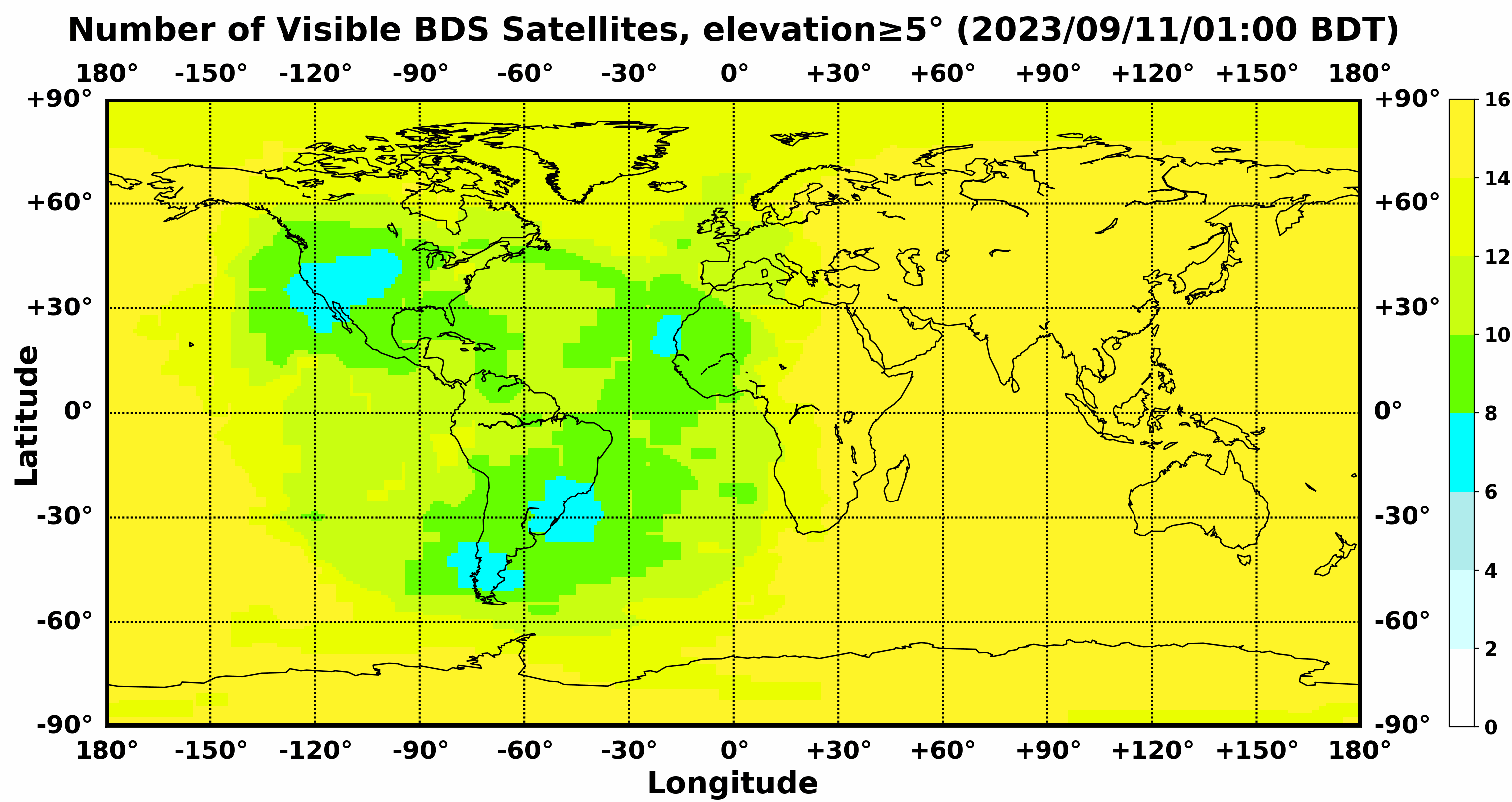 此处显示的是北斗卫星导航系统在全球任意地点可以看到的卫星数目,用不同颜色表示不同数值(颜色与数值的对应情况参见右侧的图例)。
