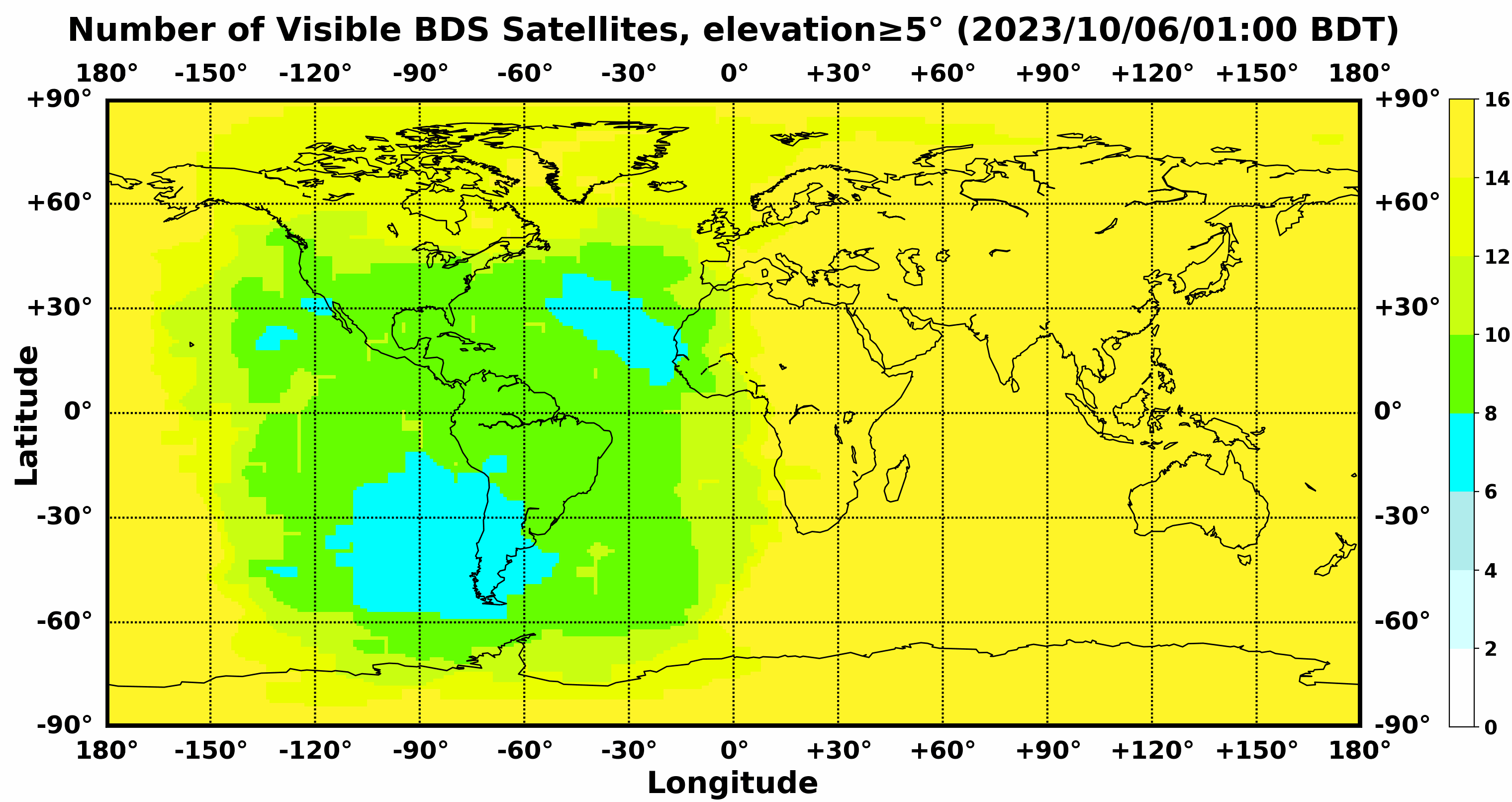 此处显示的是北斗卫星导航系统在全球任意地点可以看到的卫星数目,用不同颜色表示不同数值(颜色与数值的对应情况参见右侧的图例)。