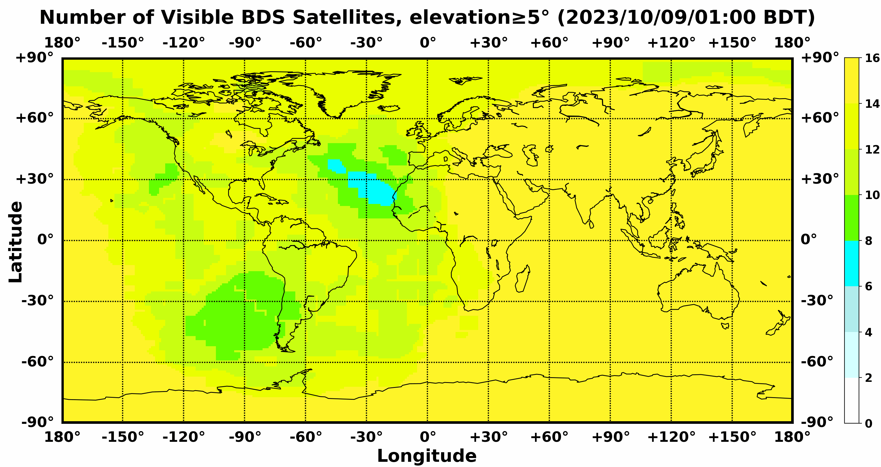 此处显示的是北斗卫星导航系统在全球任意地点可以看到的卫星数目,用不同颜色表示不同数值(颜色与数值的对应情况参见右侧的图例)。