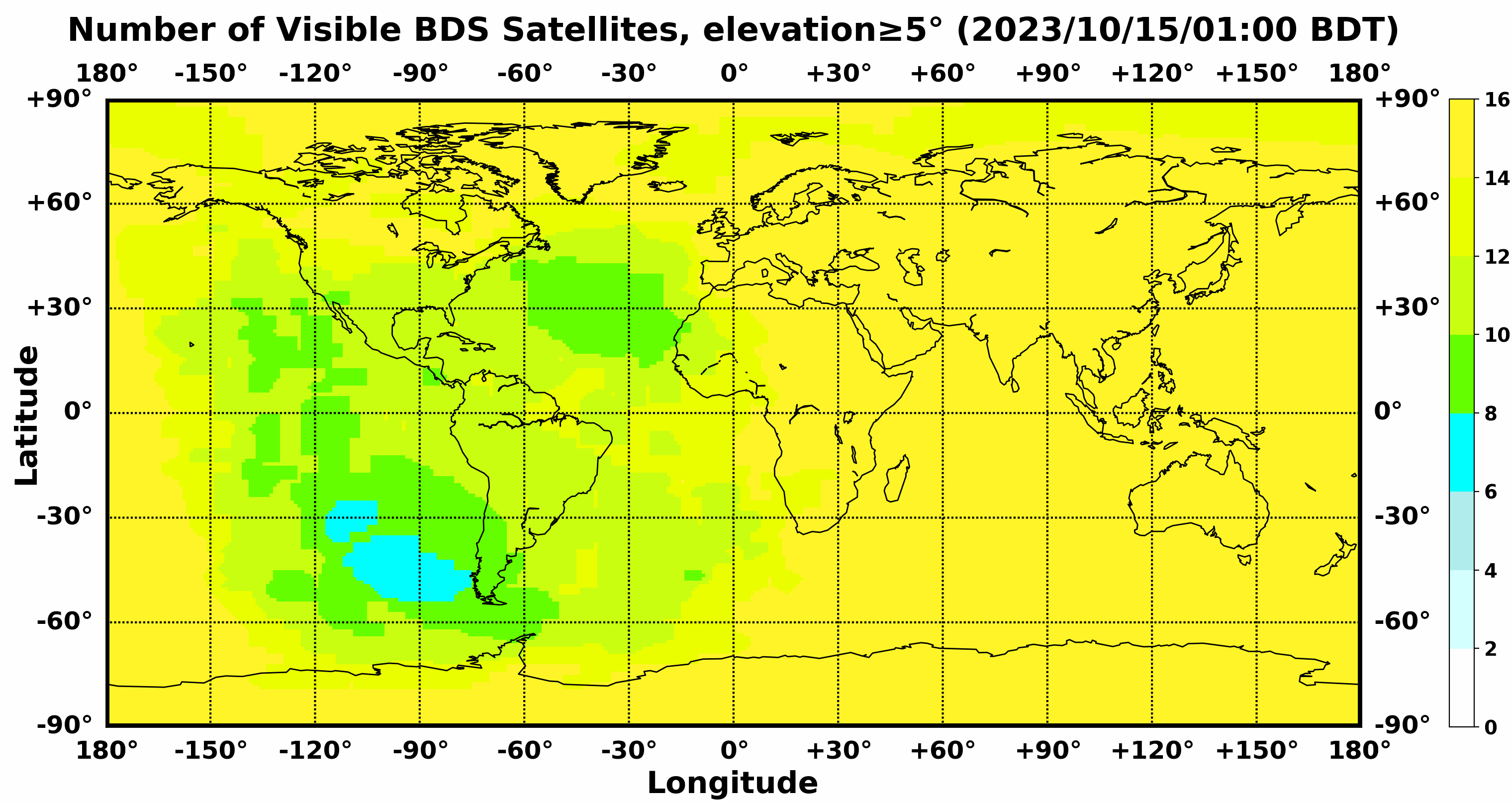 此处显示的是北斗卫星导航系统在全球任意地点可以看到的卫星数目,用不同颜色表示不同数值(颜色与数值的对应情况参见右侧的图例)。
