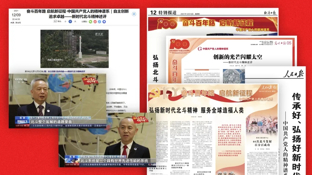 今年是中国共产党成立100周年,党中央批准了中央宣传部梳理的第一批纳入中国共产党人精神谱系的伟大精神,在中华人民共和国成立72周年之际予以发布。“自主创新、开放融合、万众一心、追求卓越”的新时代北斗精神位列其中。持续受到人民日报、新华社、中央广播电视总台、光明日报、经济日报等多家主流媒体关注和报道,得到社会各界传播与弘扬,掀起了讲述新时代北斗故事、传播新时代北斗精神的热潮。