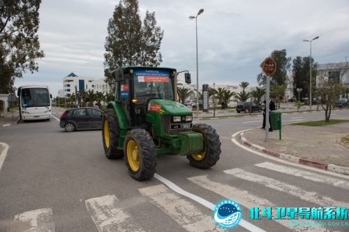 4月1日,在突尼斯首都突尼斯市,一辆安装了北斗卫星导航系统自动驾驶设备的农用拖拉机在第二届中阿北斗合作论坛期间进行无人驾驶展示(孟涛 摄)