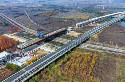 11月13日,沈海高速改扩建上跨胶济、胶新铁路立交桥钢箱梁圆满完成转体施工。