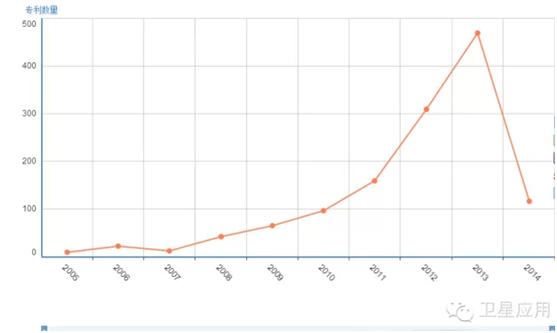 图1是北斗卫星导航相关专利随时间的变化情况。从图中可以看出,相关专利的申请基本是从2005年开始的,之前也有零星的专利申请。结合非专利文献分析,可以得知我国从20世纪80年代初开始积极探索适合国情的卫星导航系统,并于1994年启动北斗卫星导航试验系统建设,到2000年初步建成北斗卫星导航试验系统。北斗卫星导航试验系统采用的是有源定位机制,终端价格较高,系统实时性不高,定位精度与GPS相比处于劣势,从事相关技术与产品开发的企业相对较少。这一阶段的北斗建设更多的是空间段的部署,而卫星的研制与部署上由军方统一管理,保密性强,即使有专利申请也是以国防专利为主。